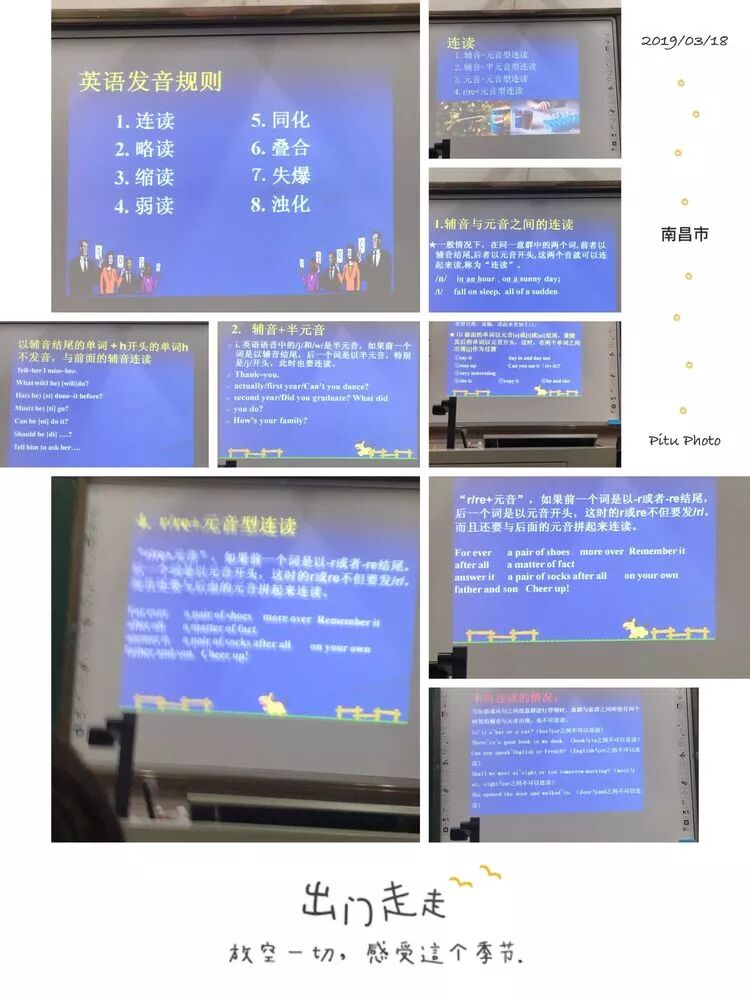 刘老师潜心钻研,从最初的音标发音,到连读,失去爆破,注意事项等知识一一呈现课件和讲解,刘老师总是微笑着面对我们这些学生,时而鼓励我们,时而为我们纠音,课堂上,我们这些学生在刘老师的组织下,一个一个地过关。我们很享受这种学生认真学习,老师严格而又活泼的教育过程。