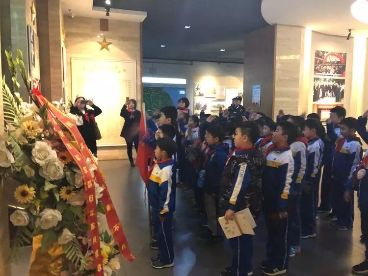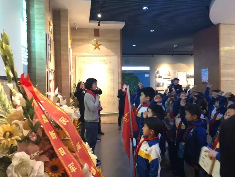 在这里少先队员为新四军馆张主任敬献红领巾。