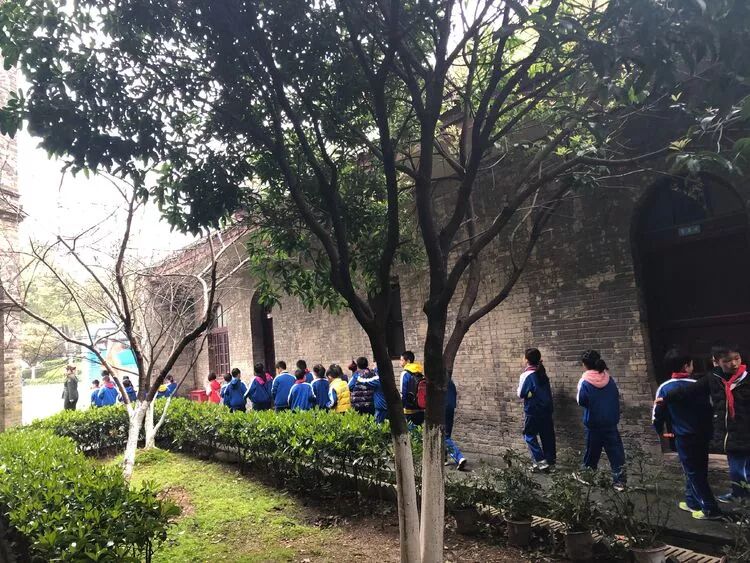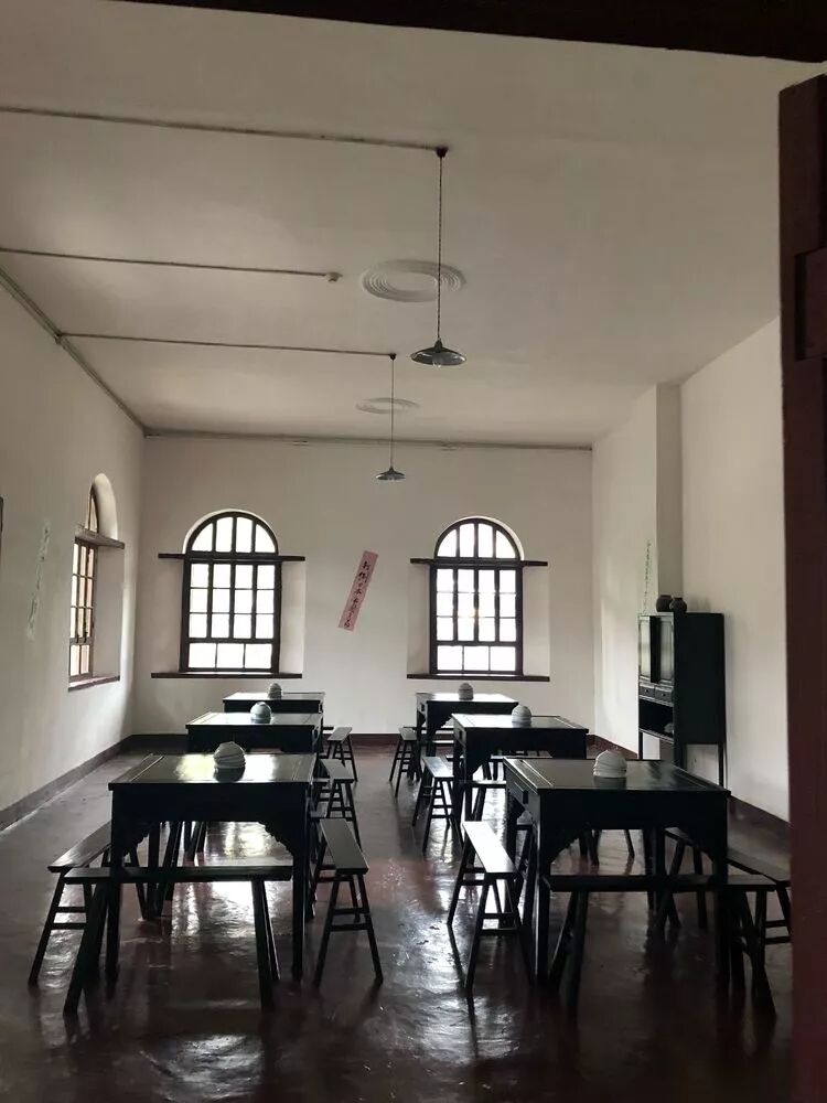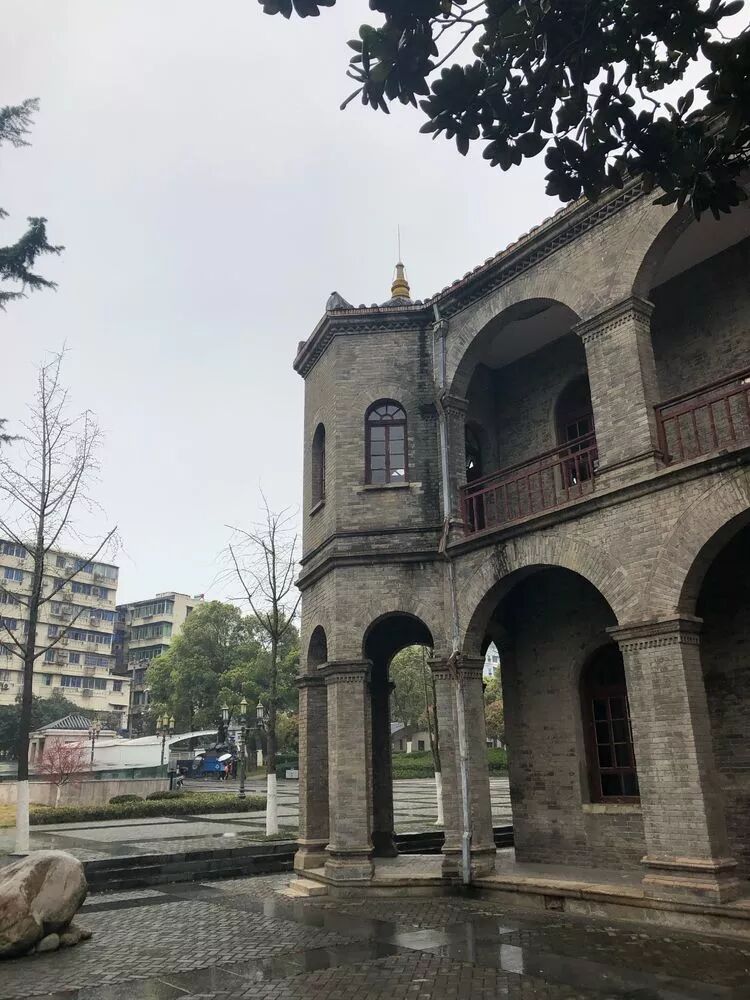 然后我们沿着通道往前走,对面就是保存良好的3栋楼房,这就是全国重点文物保护单位新四军军部旧址,讲解员带领同学们参观完了中西合璧的这3栋建筑。