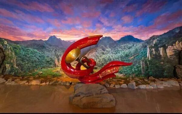 进入陈列馆序厅,首先映入眼帘的是:正中的一个圆雕塑,它是一把飘动着丝绸带的军号,像一个阿拉伯数字“4”。上面刻着新四军军歌的音符,象征着新四军在南昌吹响了南方八省红军游击队的集结号和新四军开往华中抗日前线抗战杀敌的冲锋号。